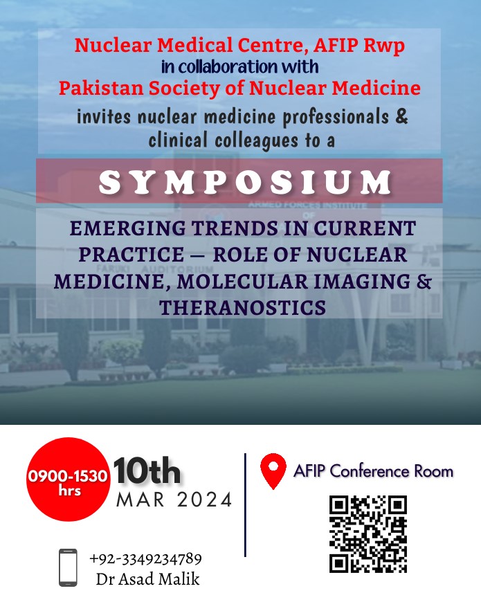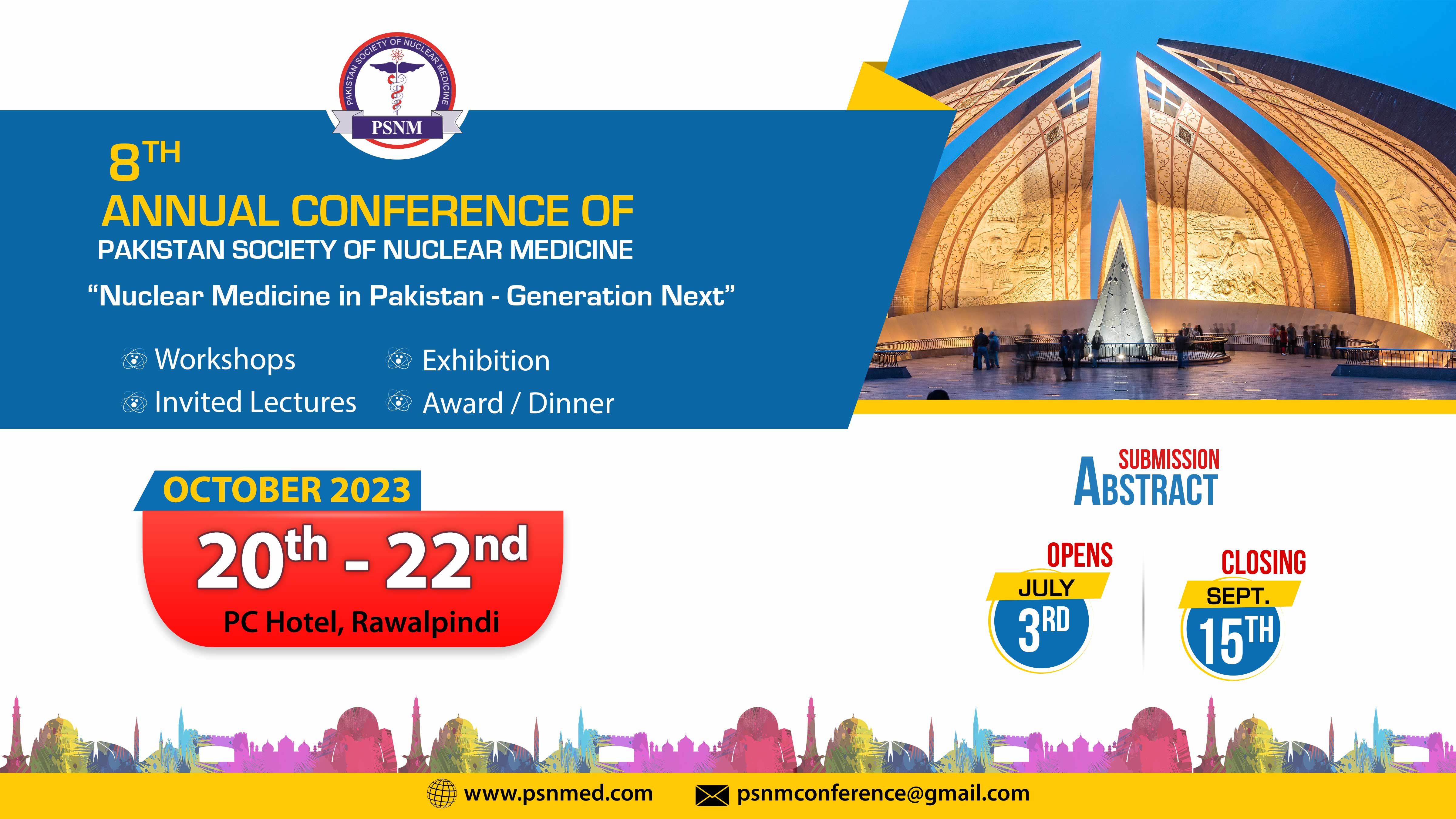 8th National Conference of Pakistan Society of Nuclear Medicine, 4th Sino-Pak and 3rd Pak Arab conference will be held at Pearl Continental Hotel, The Mall, Rawalpindi, on October 20-22, 2023. Theme of the Conference is “Nuclear Medicine in Pakistan - Generation Next" which depicts our commitment towards patient centered care by integrating latest imaging and therapeutic advancements with enhanced radiation safety measures.