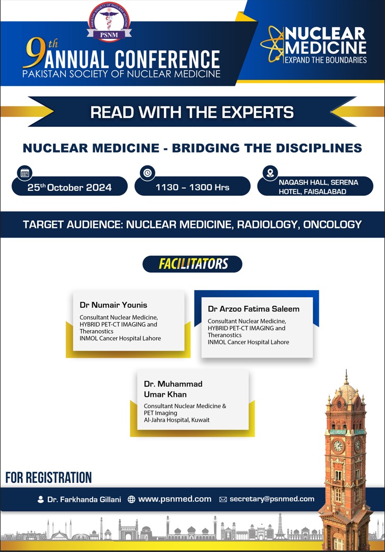 9th Annual Conference of Pakistan Society of Nuclear Medicine Nuclear Medicine Expand the Boundaries Read with The Experts Session: 25th Oct, 2024 Venue: Naqash Hall, Serena Hotel, Faisalabad 11:30 am – 01:00pm