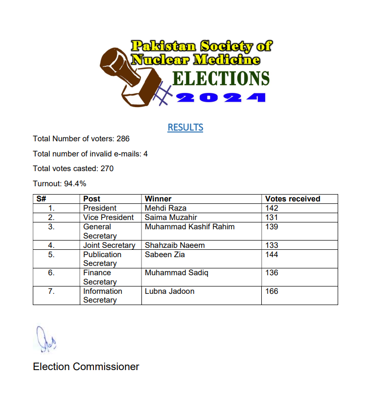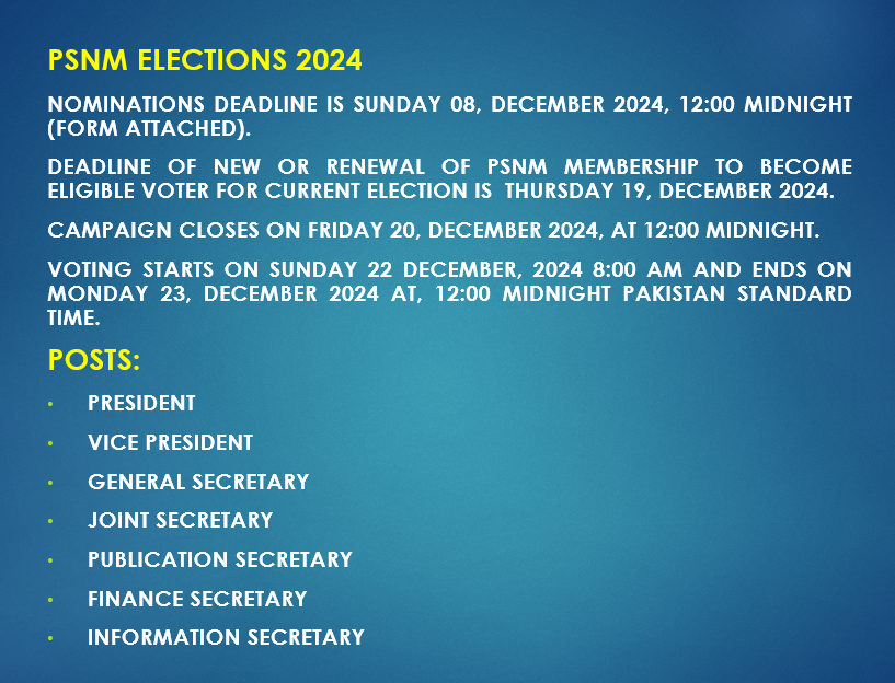 Dear Colleagues Following is the schedule of up-coming PSNM Elections 2024. Nominations deadline is Sunday 08, December 2024, 12:00 midnight. Deadline of new or renewal of PSNM Membership to become eligible voter for current election is Thursday 19, December 2024. Campaign closes on Friday 20, December 2024, at 12:00 midnight. Voting starts on Sunday 22 December, 2024 8:00 AM and ends on Monday 23, December 2024 at, 12:00 midnight. (Pakistan Standard Time). Posts: President Vice President General Secretary Joint Secretary Publication Secretary Finance Secretary Information Secretary PSNM Election Commissioner paksnm.ec@gmail.com